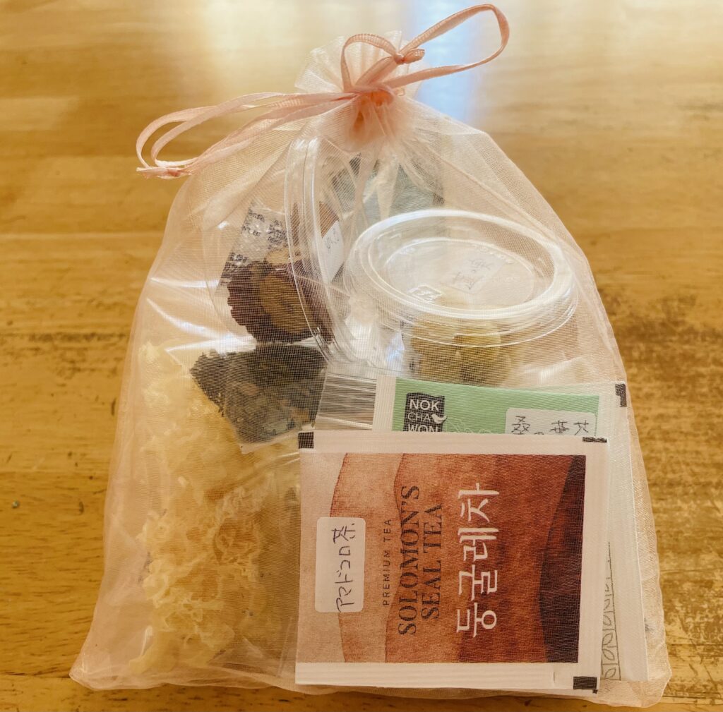 講座でお土産にいただいた「お茶セット」。なつめ、クコの実、黒豆、白キクラゲ、甘草、菊花、陳皮、薄荷、桑葉、ドクダミ、蓮の実が入っていました。
